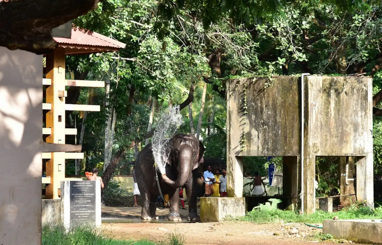 Punnathur Kotta (Anakkotta), an elephant sanctuary near Guruvayur Temple, home to dozens of elephants owned by the temple, serving as ritual offerings and training grounds for festivals like Thrissur Pooram